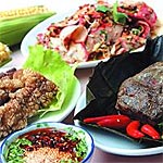 涼拌叉燒、豬腦煎蛋、脆皮鍋燒、葉子包肉、鍋子菜湯、醃菜炒肉