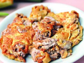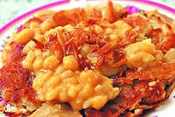 上酥下軟的脆皮鍋燒,是以梅花肉經過三次油炸手續,將油脂炸乾逼出,單吃可嘗到香酥原味、沾了醬則完全去油。豬腦煎蛋則是緬甸人愛吃的口味,貪就貪那股軟嫩。